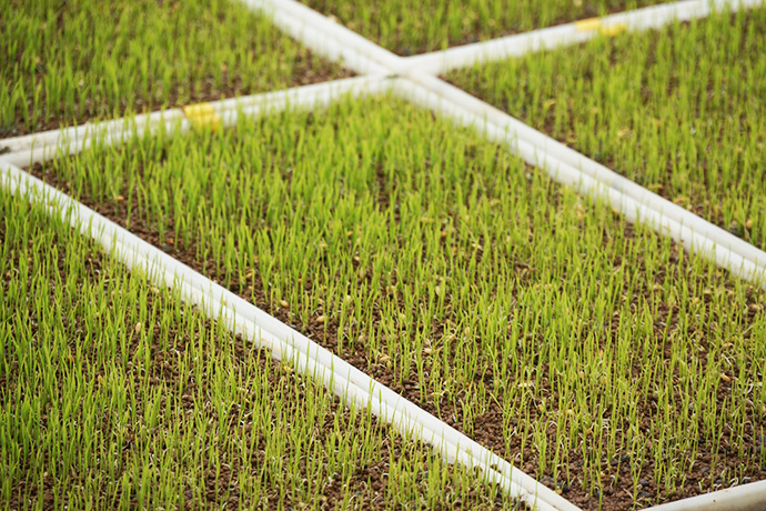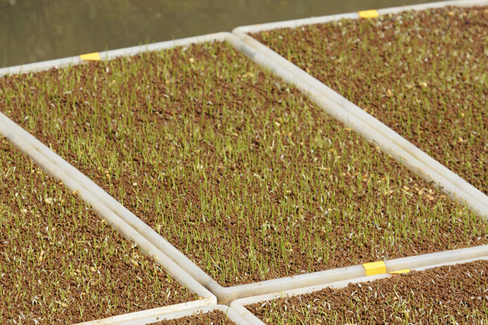 種をまいたら、その上に土を薄くかぶせます。それを棚田に並べて完成です。