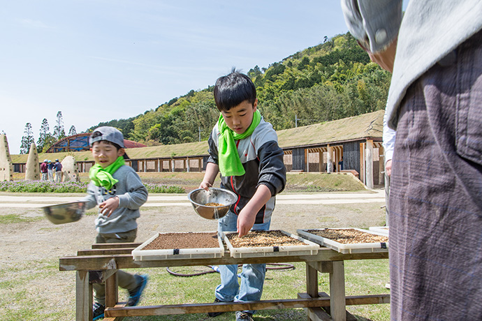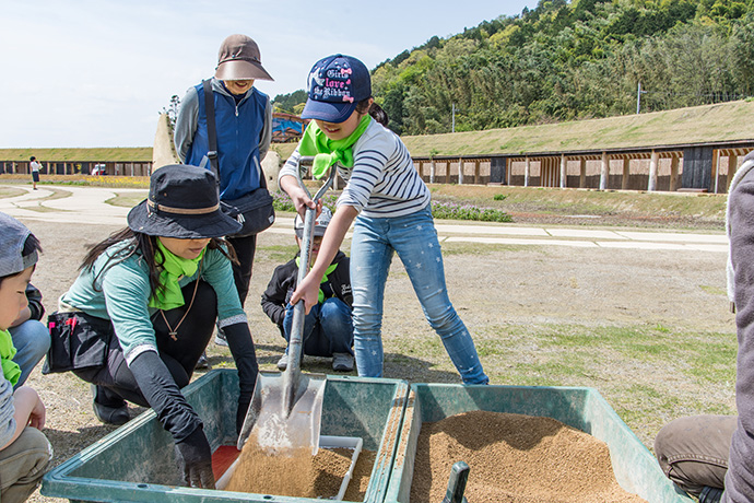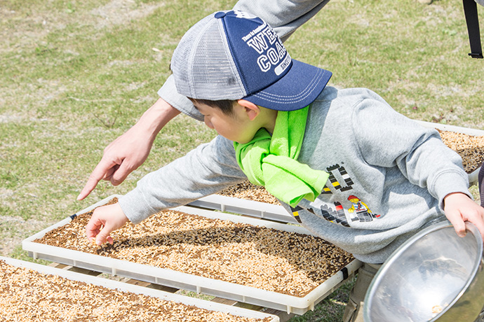 土入れの次は、種まきです。キヌヒカリという品種の種をまきました。小さなお子さんは、お父さんからの手助けやアドバイスがあり、親子作業も楽しそうでした。