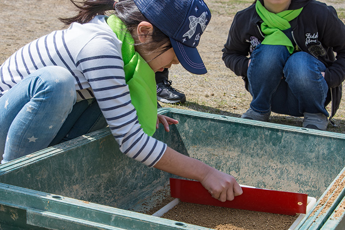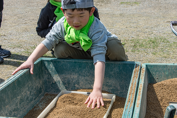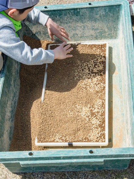 勉強の後は、本日のメインの種まき作業です。まずは、育苗箱に土を入れていきます。作業になったとたん、子どもたちの顔はイキイキとしていて、作業も順調に進んでいきます。