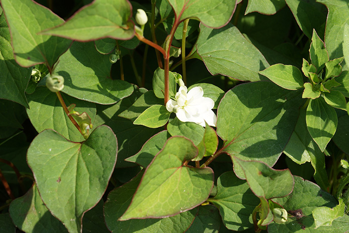 ドクダミは十薬(じゅうやく)とも言われ、八重咲の白い可憐な花を咲かせます。