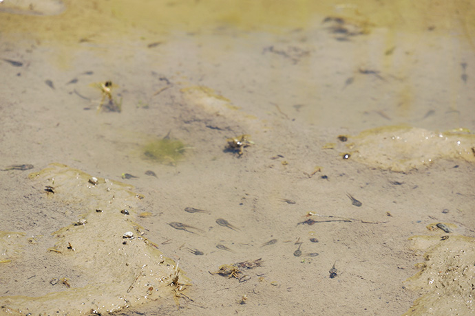 田んぼにはたくさんのオタマジャクシ。本当にたくさん泳いでいます。カエルの鳴き声もよく響いていますよ。