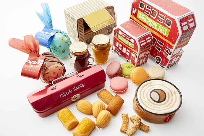 クラブハリエキッズの商品はもちろん、工具箱に入った小さく可愛らしいマドレーヌ・フィナンシェ・オレンジケーキの詰め合わせやギフトショップ限定のバームパイのほか新たにマカロンやコンフィテュールが限定パッケージで並びます。