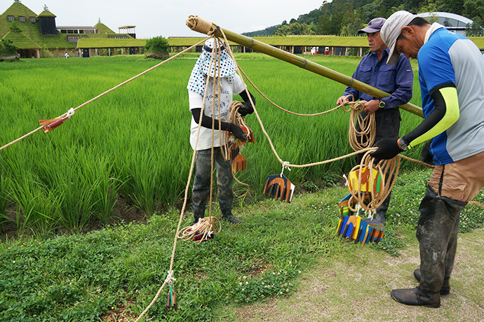 7月28日、青々と稲の伸びる田んぼに今年も鳴子(なるこ)の仕掛けを設置しました。