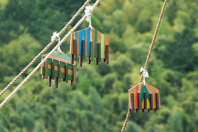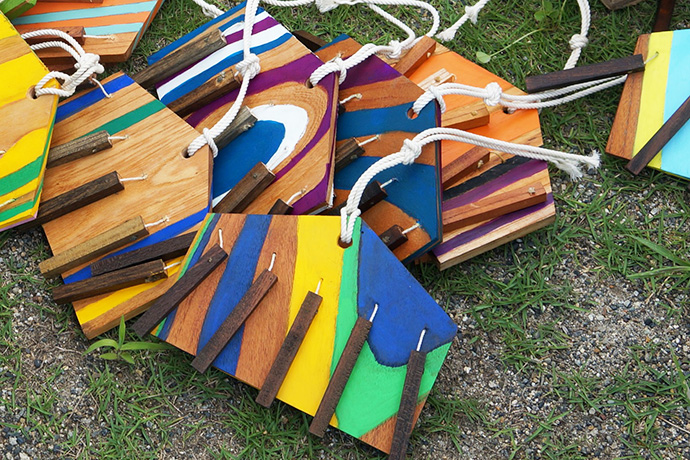 今回は設置場所を去年の3か所から6か所に増やし、再利用の板もあわせ100枚以上の鳴子を使いました。そしてお気づきでしょうか。今年の鳴子はとってもカラフル――実はこれ成安造形大学との合同プロジェクト作品なのです。