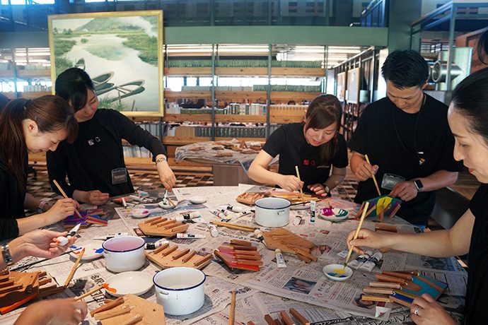 たねやグループの社内スタッフもまた、板ごとに違う木目に苦労しながら思い思いの色で仕上げました。