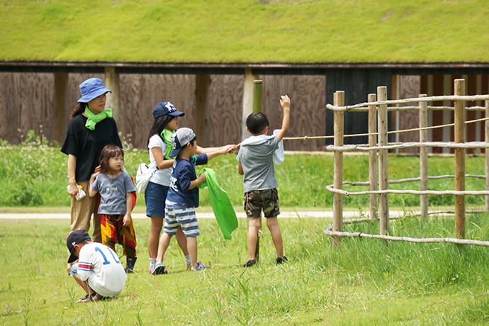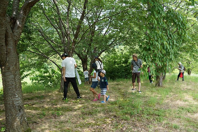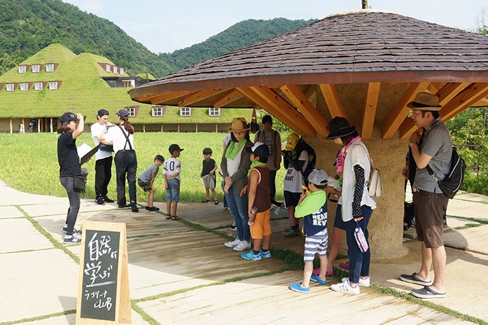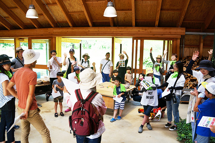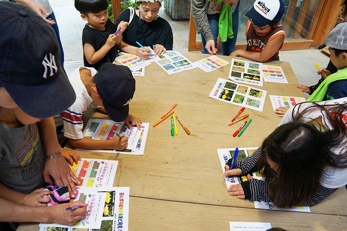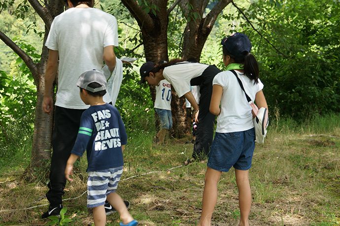 再び棚田から農藝に移動し、自然の中にはいろいろな生きものがうまく隠れているんですよという話を聞き、ゲームが始まりました。あらかじめ先生が自然の中に隠した物を探すゲームです。いくつ隠れているか、自分の心の中でこっそり数えます。なかなか難しいゲームに子どもも大人も真剣。