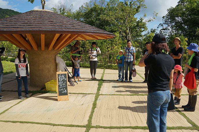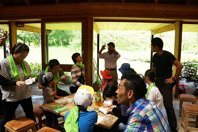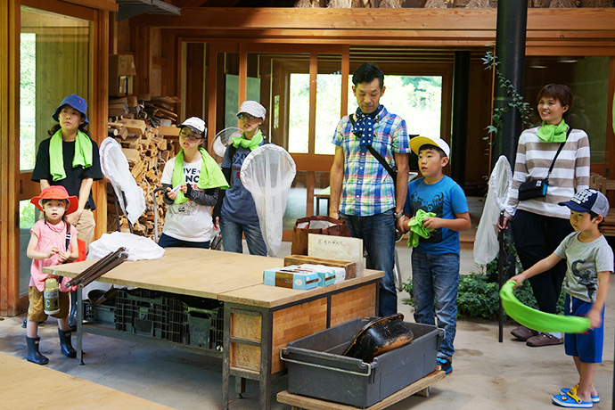 生き物の観察の講師には、龍谷大学の樋口先生が来てくださいました。元気に挨拶をして今日のプログラムが始まります。