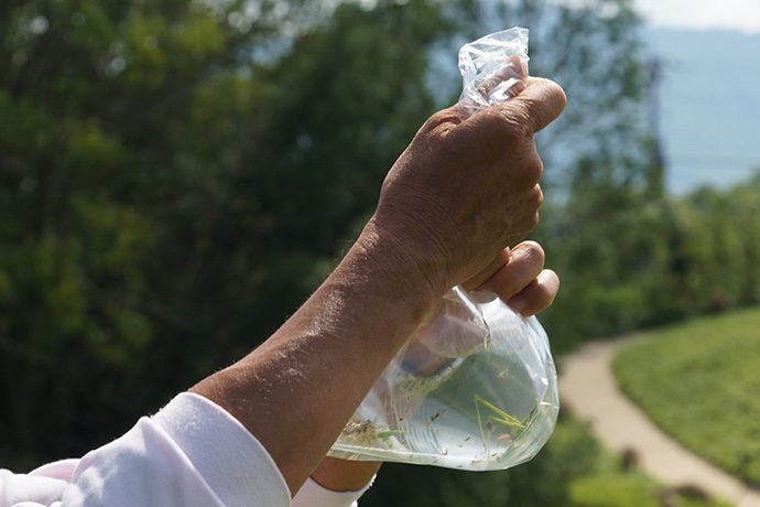 先生が田んぼの稲のところで少し虫取り網を動かすだけでこんなにたくさんの虫!「こんなにいるんだ!」「バッタもいろいろいるね」とテンションがあがります。