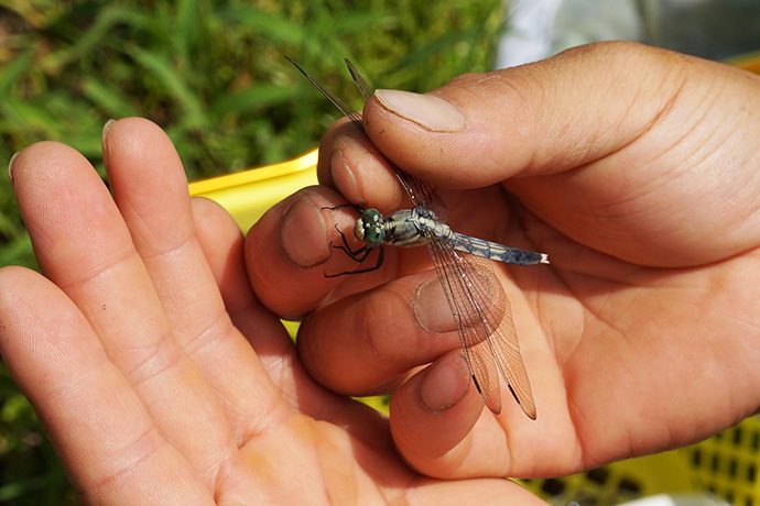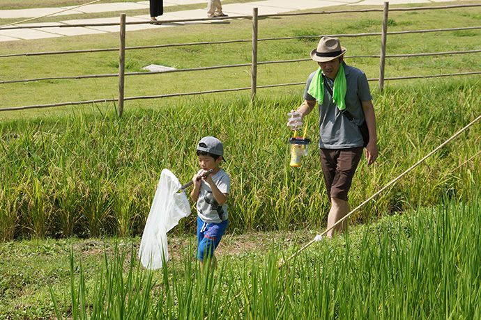 稲が育ってきた田んぼで「まずは虫取り網を使わず、自分の目で虫を探してください。まだとらないで、まずは見てみましょう」と先生。青々と生長した稲の上をトンボが飛んでいたり、あぜにはバッタがいます。「たくさんいるね!」「他には何がいるかな?」とワクワクしている子どもたちの声。