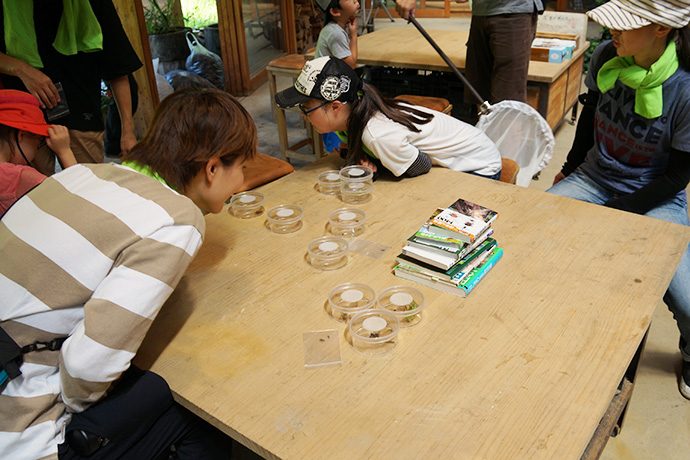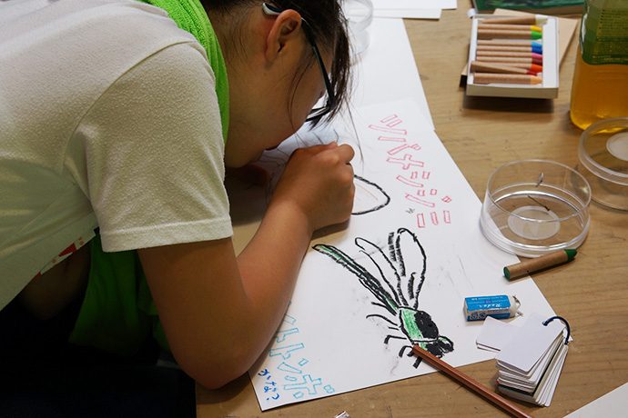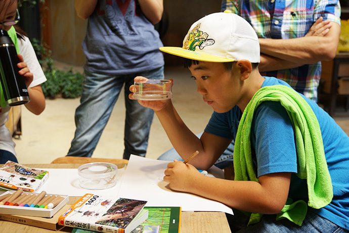 虫を捕まえた後は農藝に戻り、図鑑で調べたり先生やお父さんお母さんに聞いたりして自分が捕まえたのはどんな虫なのか調べてスケッチします。