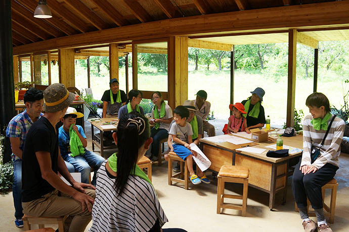 農藝へ移動し、先生から今日の活動内容のお話がありました。「田んぼにいる生き物の観察をします。捕まえるのは観察の後です。まずは田んぼに行きましょう。何か質問はありますか?」という問いかけに「早く行きたいです!」の声。