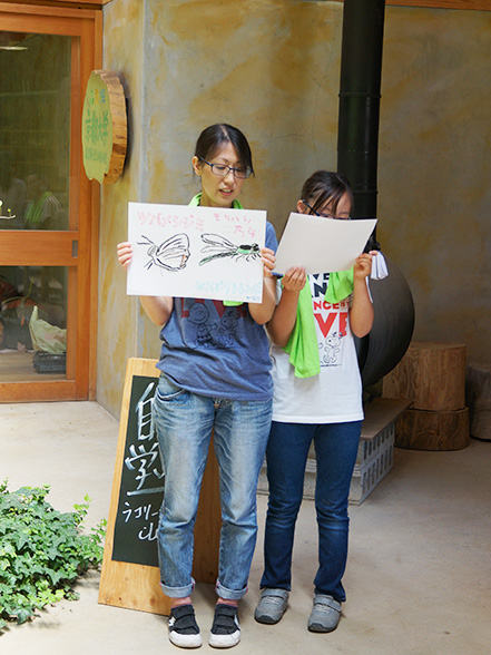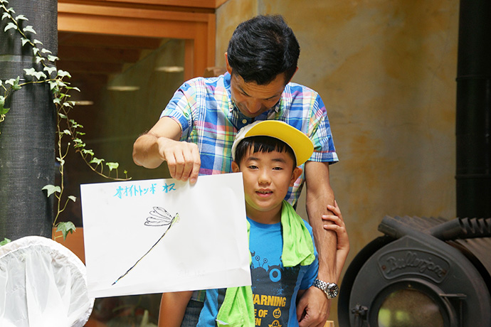 自分が捕まえて、スケッチしたものを最後に発表します。が、なかなかいざ発表となると恥ずかしがる子が多く、お父さんやお母さんに手伝ってもらって発表している子も。