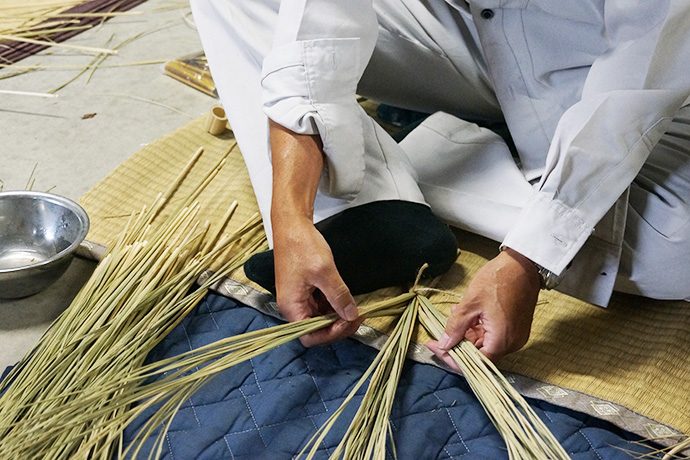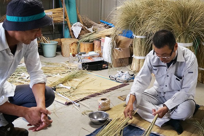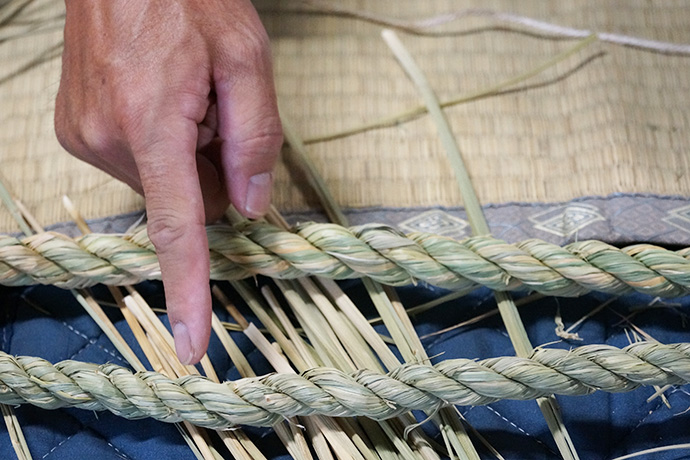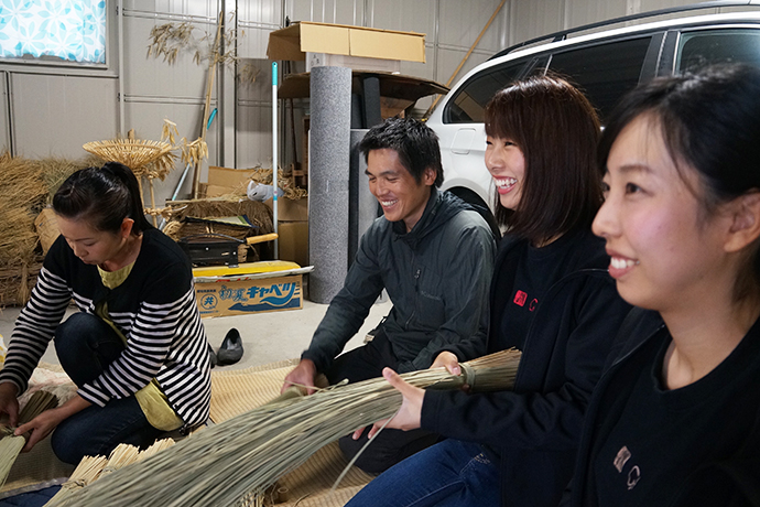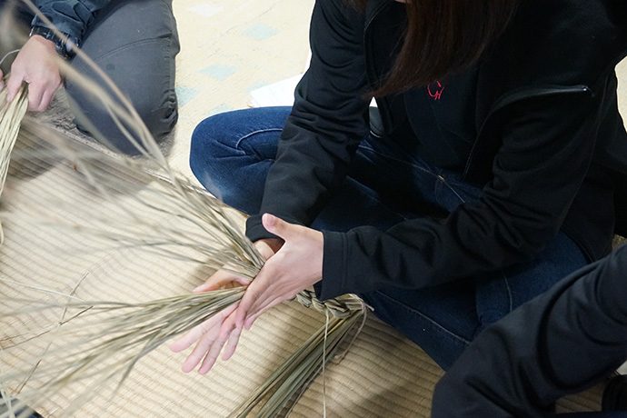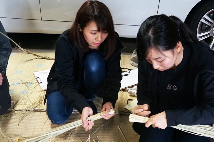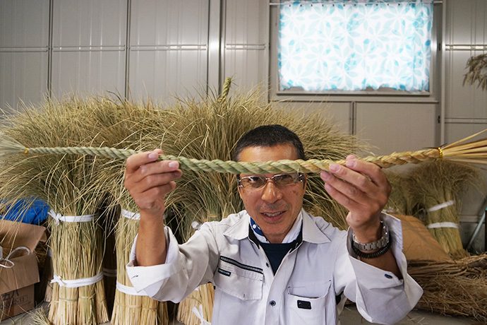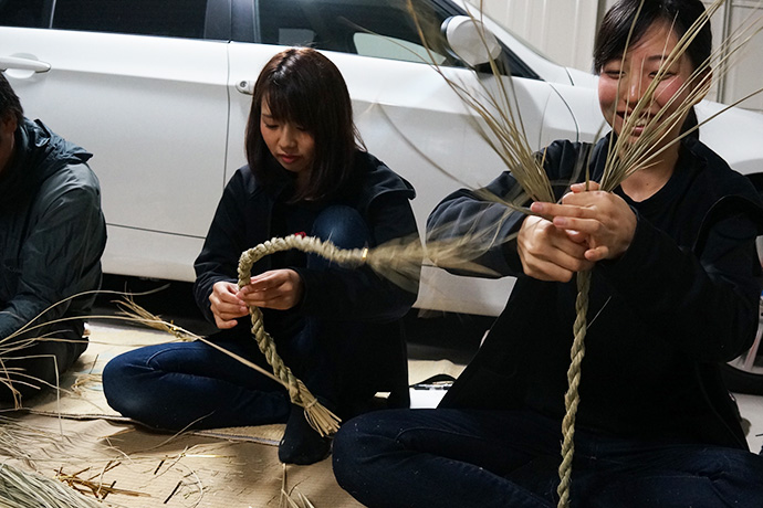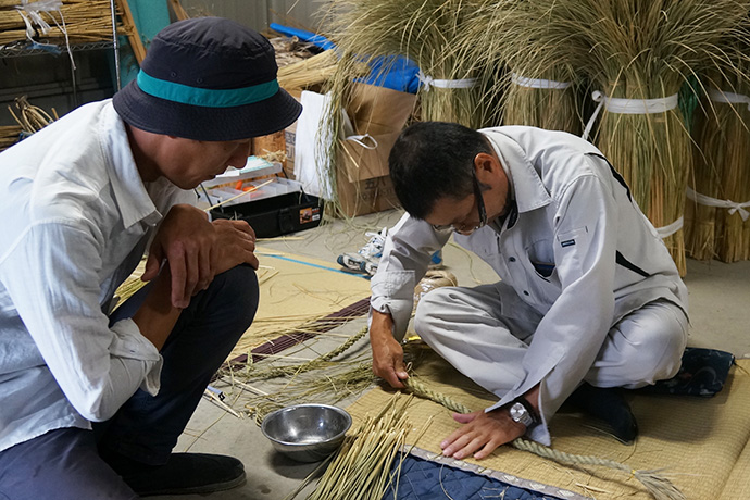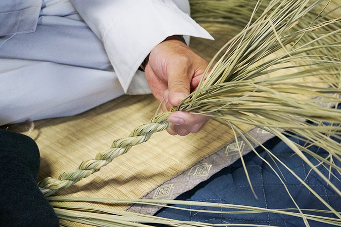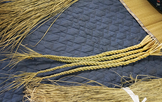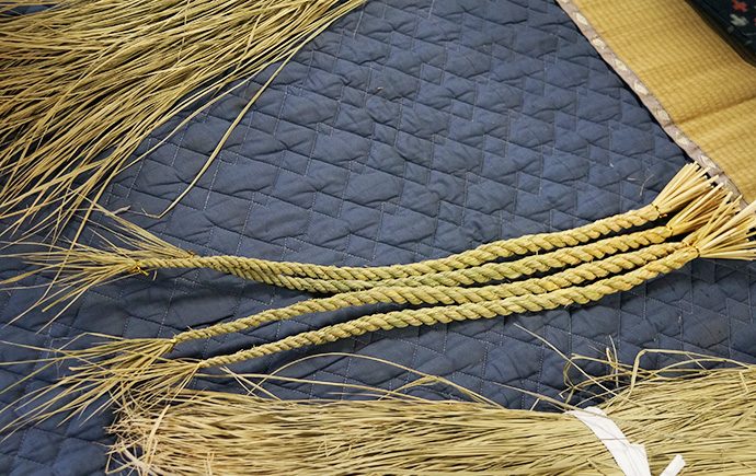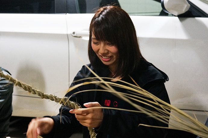 作業を見つめるスタッフから「松明やしめ縄を作るのは、男性が作るとか女性はダメとか決まりはあったのですか?」の問いに「昔はあったかもしらんけど、男女は関係あらへんと思うてる。神様に喜んで貰いたいという気持ちが大切。より綺麗な方が供えられた神様もきっと嬉しいやろうしね」と。他にも、しめ縄や松明づくりに使う藁(わら)は穂がなる前に刈ってしまうとか、しめ縄は雲を表しているなどのお話しが聞けました。