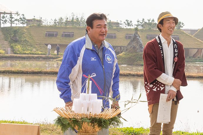 子ども松明の作り方を教えていただく先生は「文化遺産として松明を次世代に贈る会」会長の大西實さんと副会長の田中由久さんです。松明の意味や歴史を教わりながら作っていきます。