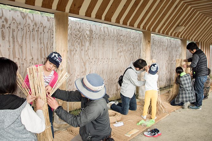 ヨシを巻きつけ終えたら、余分な長さをカットして縄で縛って仮止めを外していきます。