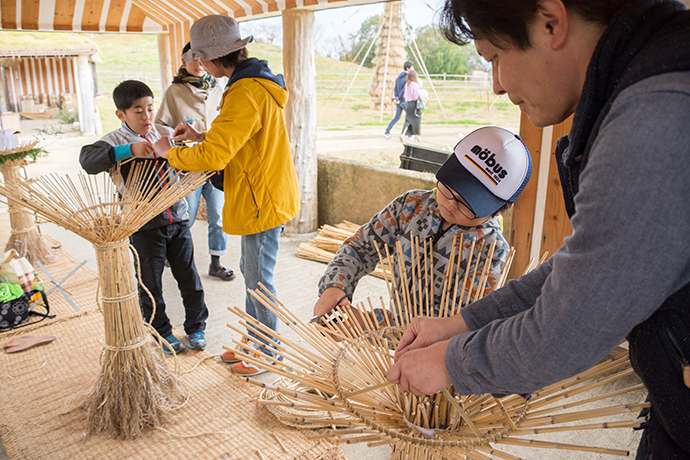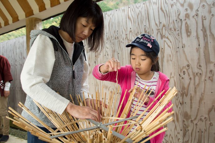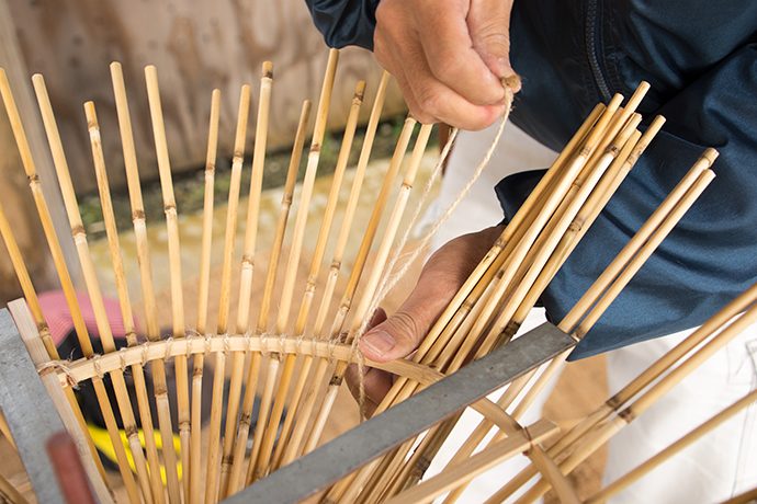 次は笠の部分。ヨシの先端を折り曲げ、広げていきます。