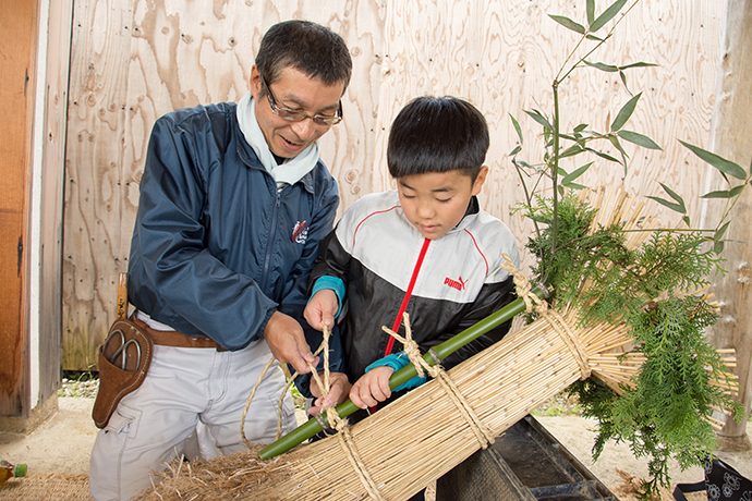 ヒバやしめ縄で飾り付けをします。ここでもどの部材を使うかで個性がでます。