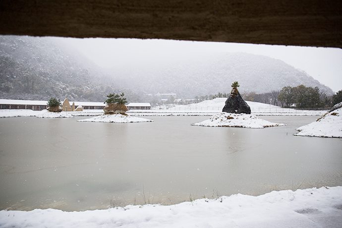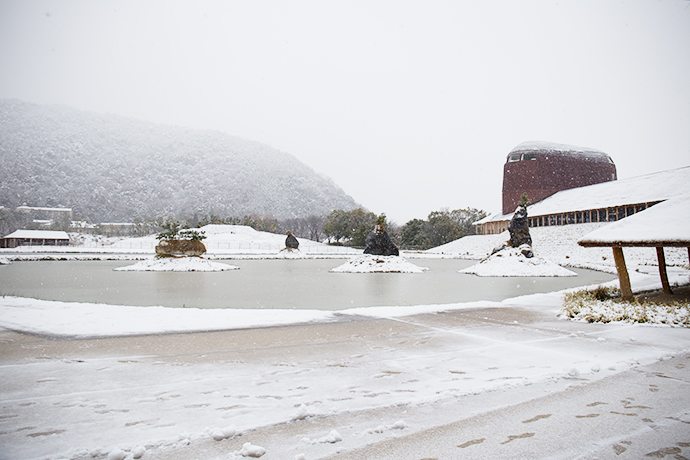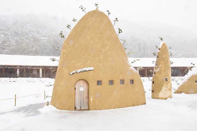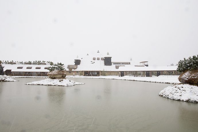 夏には鮮やかなグリーンに、秋からはだんだんと茶色くなっていたメインショップの芝屋根も、雪をかぶると白い空と一体となって不思議な印象になります。
