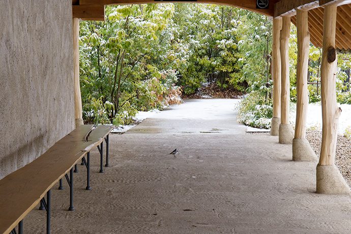足元の悪い日にもかかわらず訪れてくださったお客さまからは、思わず「わー!きれい!」という歓声が上がっていました。メインショップの軒下では、雪をよける小さな鳥との出会いも。