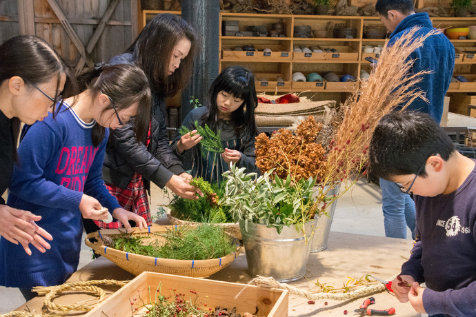 一般的によく見る御幣が付いたしめ縄飾りとは違って、ラ コリーナCLUBならではのどんぐりや枝などを使ったリースのようなしめ縄を作っていきます。