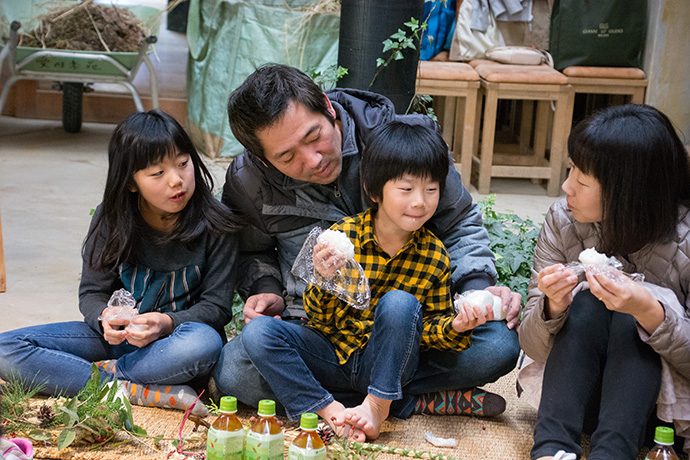 さて、ここで、みなさんが種まきからはじめ、刈り取ったお米キヌヒカリで作ったおにぎりを食べながら、感想を聞いていきたいと思います。」