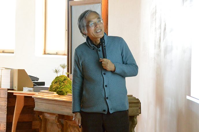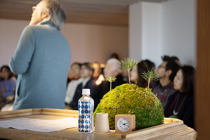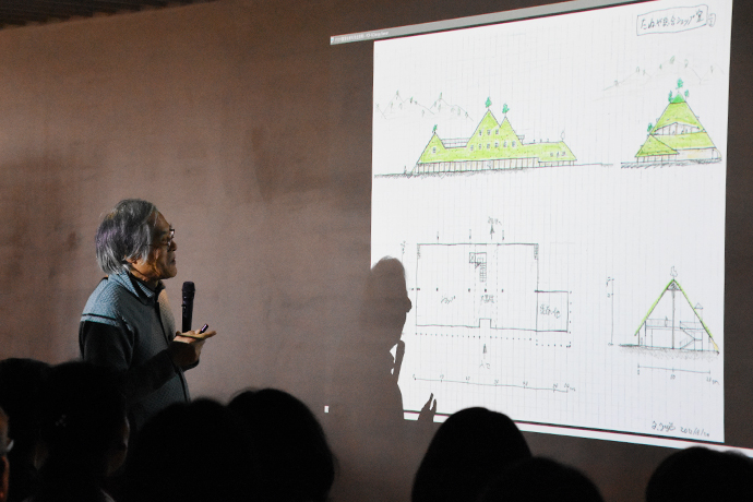 ツアーの後は、いよいよ講演の時間。会場は藤森先生の登場を楽しみに待つみなさんで満員でした。 たねやグループが藤森先生にラ コリーナの設計をお願いしたのは今から5年前のことです。 「“La Collina(ラ コリーナ)”イタリア語で“丘”というのが、唯一私に伝えられたコンセプトでした」 ラ コリーナができる前のお話から始まりました。