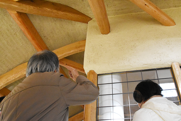 メインショップの漆喰(しっくい)の壁には山本や従業員も参加して炭を貼りました。※当時の日誌はこちら