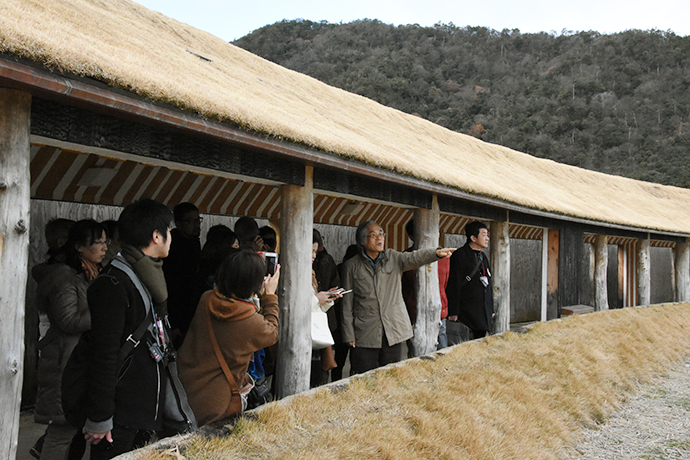今では多くのお客さまが写真を撮るスポットとなっている「土塔(どとう)」を指差しながら、