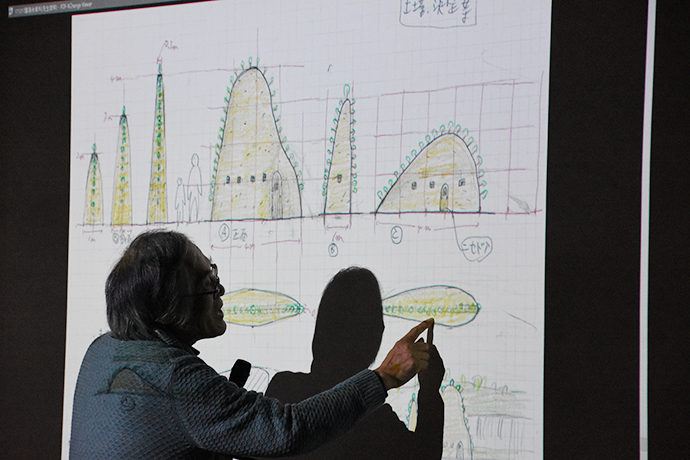 「屋根や岩の上の木は何ですか」という参加者からの質問には、「松」と答えながらも「本当は槙(まき)の木が植えたかったんですが、枯れちゃってね」と藤森先生。