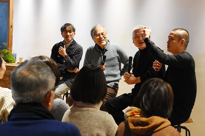 次はイラストレーターの南伸坊さん、たねや山本、進行役に今回の作品集のクリエイティブディレクションをしてくださった丹治史彦さん(信陽堂編集室)を迎えたトークセッションです。 共に路上観察の活動をされているご盟友・南さんは、さすがの息のあったトークで会場を盛り上げてくださいました。先生もとっても楽しそうです。 ※関連日誌「ラ コリーナで路上観察!?」