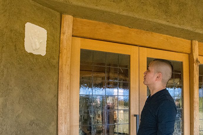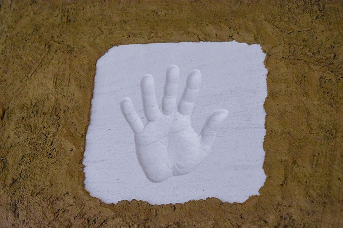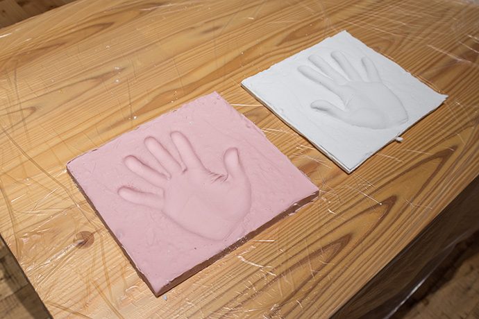 今回は土壁塗りのひと月ほど前に本社事務所で山本の手の型取りをし、多くの来店者が手を重ねても削れないようにメインショップで使っている大理石と同じ石で手形を作りました。