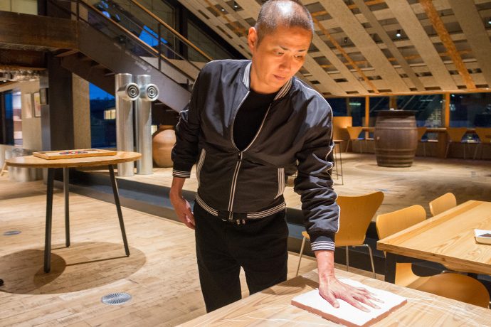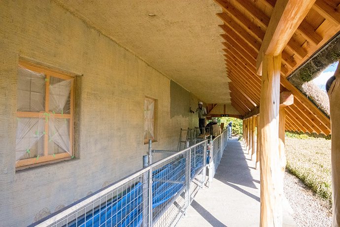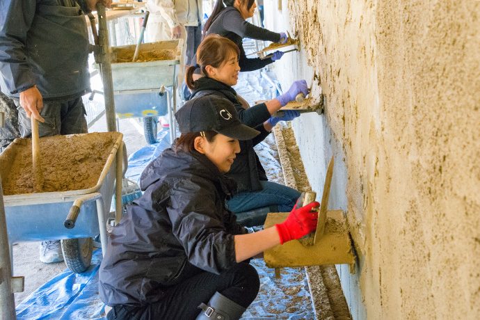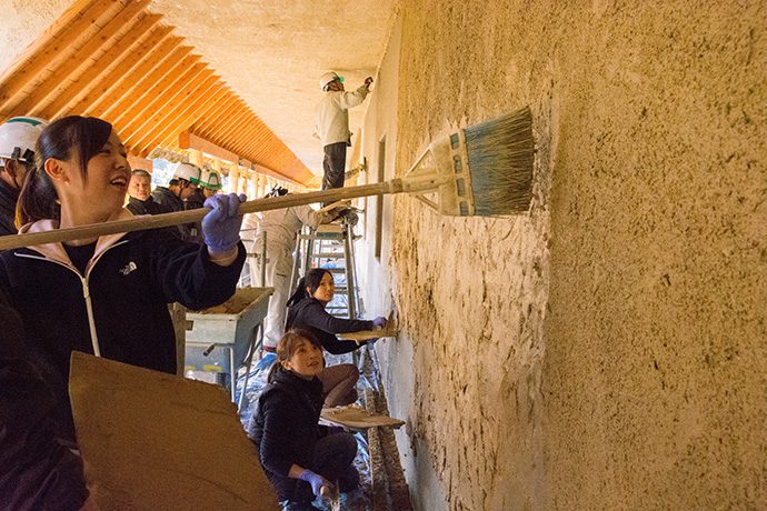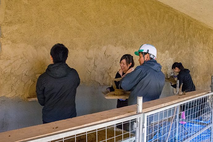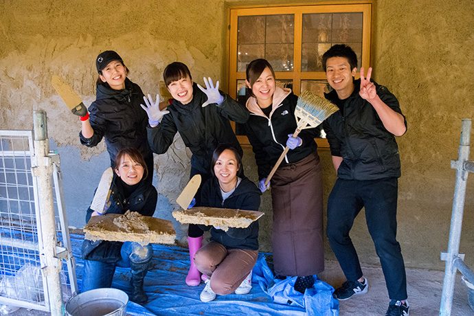 最初にオープンしたメインショップの土壁は従業員と近隣の大学生、たねやグループCEO・クラブハリエ社長が加わって2日がかりで作業を終えたものです。