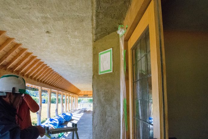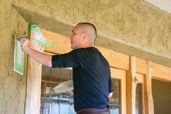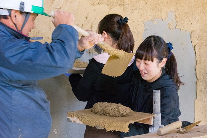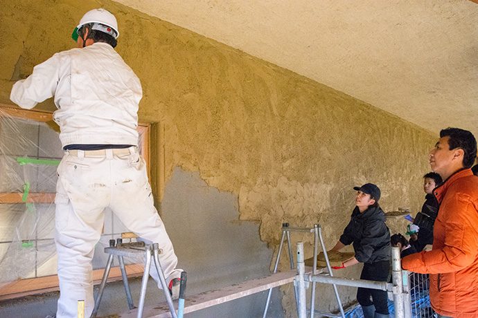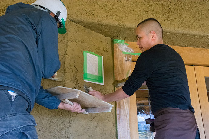 コテ板に土を盛ると、その重さに「これ、右手で受けてる土の重さがだんだん耐えられんようになるとちゃうかな」と、ちょっと苦笑いで、コテを使って壁に土を塗り始めます。