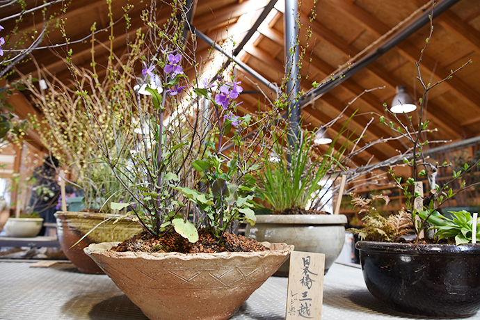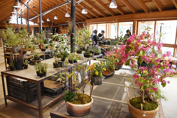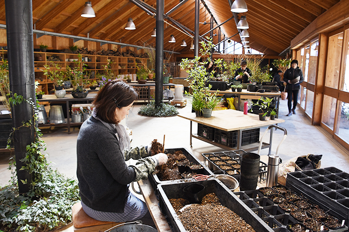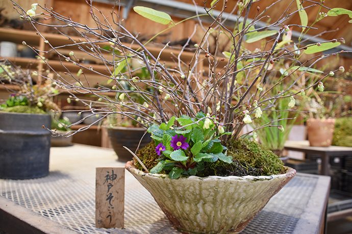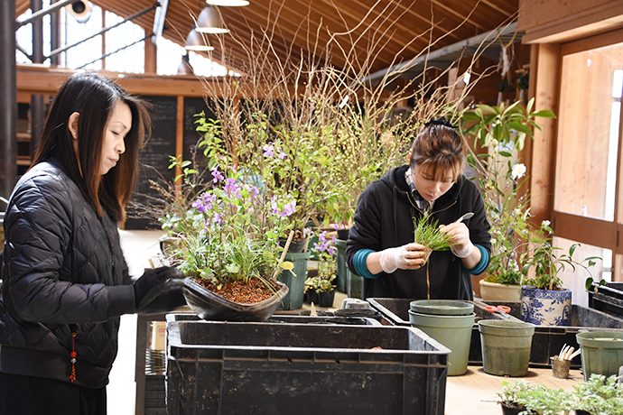 年間約500種類の山野草を育てる愛四季苑では、ちょうど各店に送る寄せ植えの準備真っ最中。