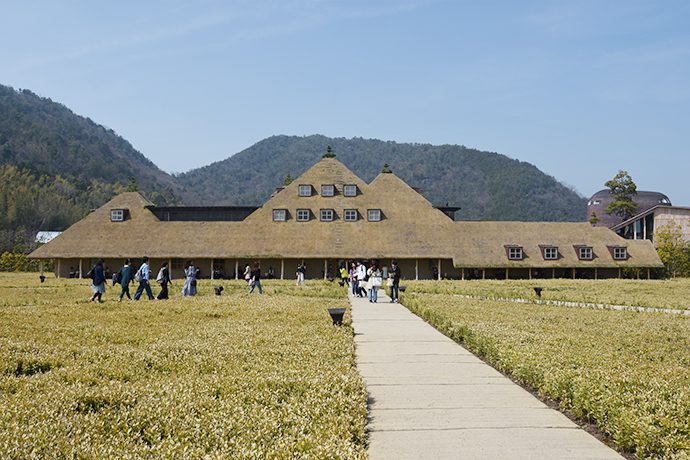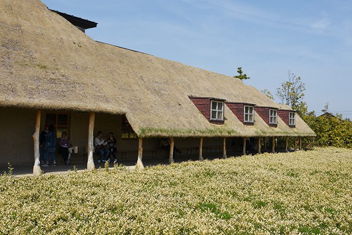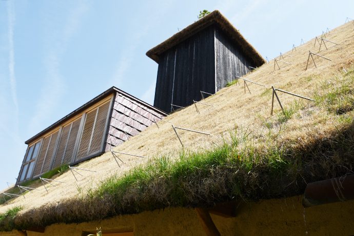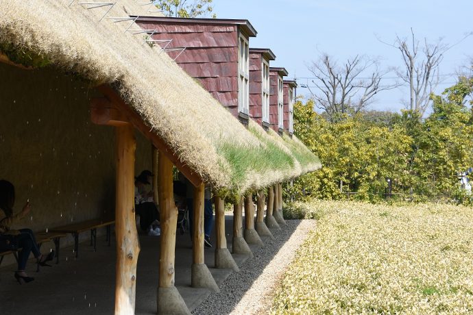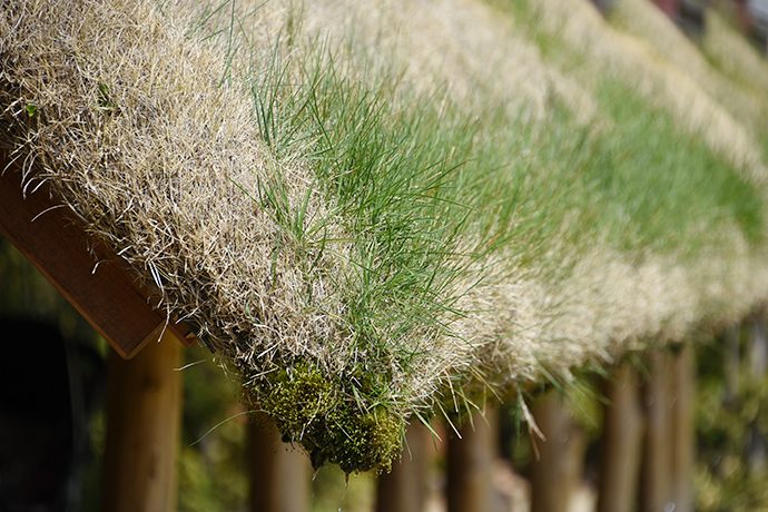 メインショップの草屋根。実はまだ、茶色い状態なんです。
