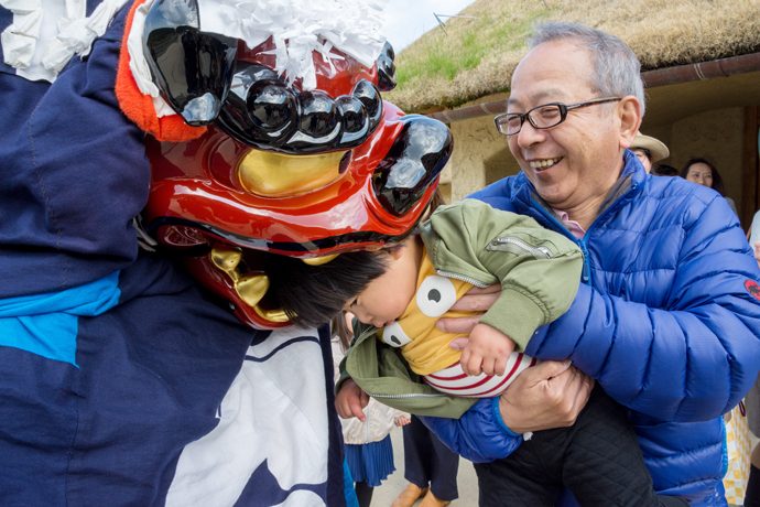 沢山の演目のあとには、獅子舞に頭を噛んでもらうお客様も。
