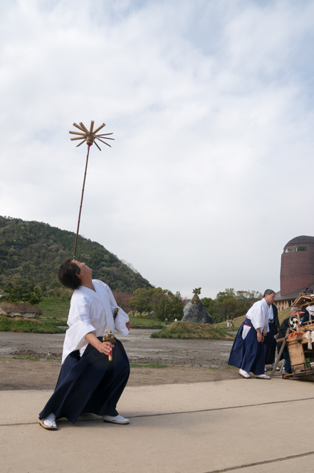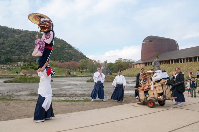 4月8日(日)ラ コリーナ近江八幡に伊勢太神楽(いせだいかぐら)がやって来ました。 1年を通して西日本各地を巡りながら獅子舞や曲芸を演じる伊勢太神楽。雨上がりで気温が低く風も強いなか、 伊勢大神楽講社 山本源太夫(げんだゆう)の神楽を間近で楽しみました。