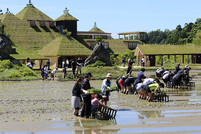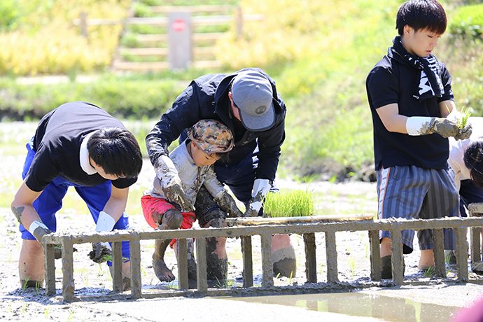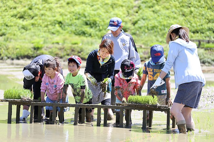 前回5月20日に行われた1回目の田植えでは、従業員やその家族、地元の大学生など計62人が参加しました。