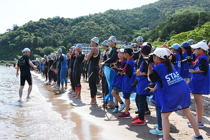 競技開始はスイムから! 子どもたちとっては海水浴などに訪れる身近な浜ですが、体操を終えた選手がずらりと並ぶといつもと違ったところに見えます。ここは“真剣勝負”の場。カメラをかまえてスタートを待つ選手の表情を狙います。