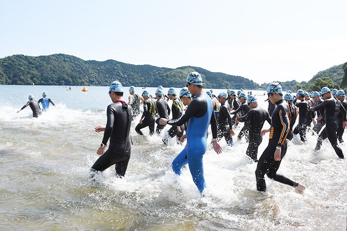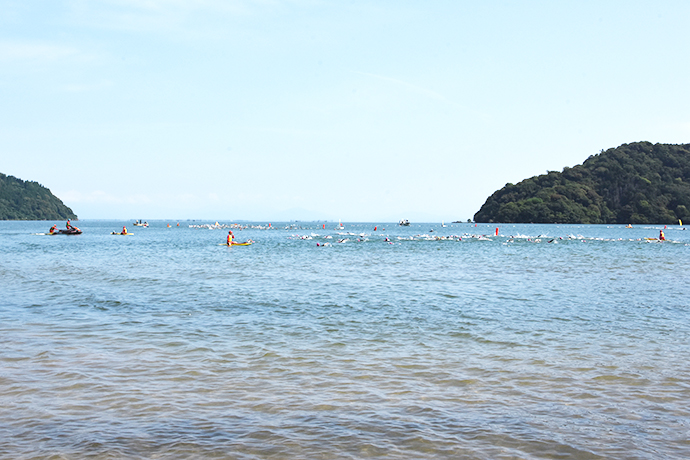 750メートルを2周。果敢に水の中に飛び込む選手を前に、応援にも力が入ります。