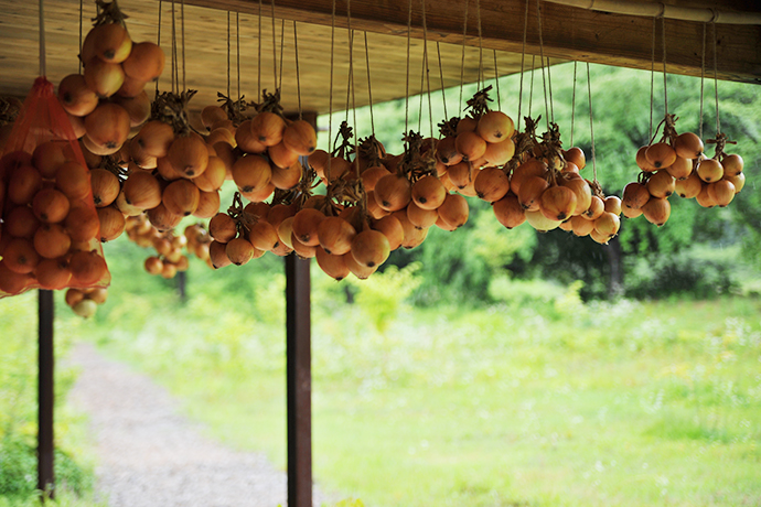 During the path we could see the massive La Collina’s building which is highly visible, as representing the most important element that keeps the surroundings together and I have not been contradicted. Once arrived I immediately noticed the continuity among nature and human activities such as the wood infrastructures, the sparkly grass on the roof (It was a stormy day) the open space interiors in wood and the huge variety of vegetables productions that surrounds the building. The dangling onions on wooden porch trave are another evidence of the human-nature continuity link. (和訳) 八幡山麓の道を歩いている間、ラ コリーナの立派な建物が非常によく見えました。これらの建物は周囲の景観に溶け込み、景色を創り出す上で重要な要素となっていると私は思いました。ラコリーナに足を踏み入れると、木で造られた施設や草屋根、メインショップの内装やディスプレイ、屋外にも水田や畑があり、自然と人のつながりを直に感じることができました。たねや農藝には、入り口の屋根にタマネギがつるしてあり、これもまた人と自然のつながりの一つのあり方だと感じました。