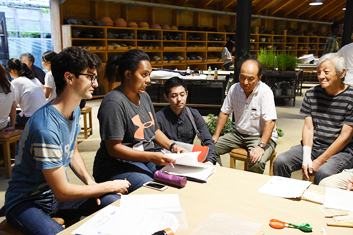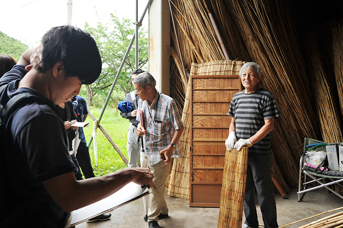 During the afternoon of 7th July, before preparing the next day group’s field study, we also understood the local activity about both, the reed harvest technique and traditional festival events by the explanation of pictures. Moreover, two women villagers showed us the creation of homemade bags from the reed harvested spreading passion about their job/ideas of revamping reed products and its territory connection. (和訳) 7月7日の午後は、翌日のグループ別調査のために準備をしました。地域の方からヨシの管理方法やお祭りとの関係などについて、写真を見せていただきながらお話をうかがいました。さらに、ヨシを使って新たに鞄などの商品を開発していることについてもお聴きし、ヨシの生産やヨシ原周辺での人と自然のつながりを取り戻すための活動に込めた熱い思いを知ることができました。