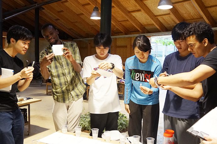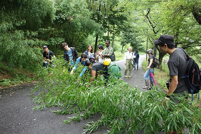 The 7th and 8th July I participated at in the Omihachiman Field Study, a program which has the objective to both, evaluate the links among Humans, Forest and Oceans and suggest improvement plans with suitable indicators. We arrived at La Collina on foot from Hachiman-yama mountain, by a path surrounded by two varieties of bamboo, where there we took water samples at the spring and experienced the cut of bamboo for the Tanabata Festival at Hachiman-yama. (和訳) 7月7日と8日に開催された近江八幡での実習では、人と森と湖のつながりを明らかにすること、また、進捗状況をきちんと把握できる地域の計画を提案することを目的としていました。7月7日はラ コリーナに接する八幡山の麓で2種類の竹を観察し、わき水を水質分析のためにサンプリングしました。また、竹を伐る体験もし、七夕祭りのために研究ステーションに持ち帰りました。