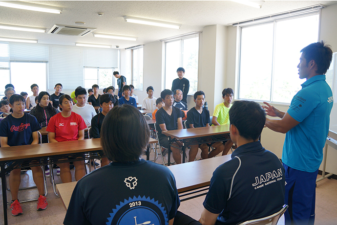 会場の近江八幡市安土B&G海洋センターは、琵琶湖最大の内湖・西の湖のほとりにあり、日頃私が練習させていただいている場所でもあります。この日はお子さんから大人の方まで大勢集まってくださいました。 ともに練習をしている八日市南高校と八幡商業高校カヌー部の高校生も前に、まずは講話をさせていただきました。真剣に聞いてくださるみなさんの表情に少し緊張しましたが、後輩でもある奥田翔悟選手(カヌースラローム/ワイルドウォーター)や中村由萌選手(カヌースプリント カヤック)も一緒に、競技に対する思いをお話ししました。