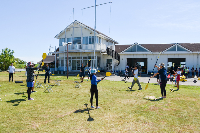 講話のあとは、いよいよ外に出てカヌー体験です!! 外は快晴!気温も高く、絶好のカヌー日和となりました。まずは、パドルの使い方を練習します。