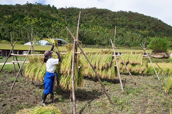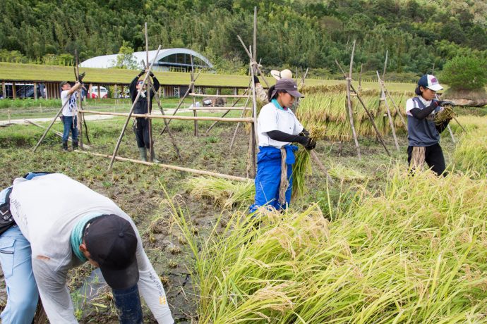 本来だと稲の束を稲架のそばまで持ち運んでから稲架にかけるのですが、今日は田んぼの土が乾いておらず泥の状態で歩きにくい…ということで、束を稲架までリレー形式で投げ渡すことになりました。 その様子は、例えるならば“空とぶ稲束”!! これには周りで様子を眺めていたお客様も驚いて見ていらっしゃいました。