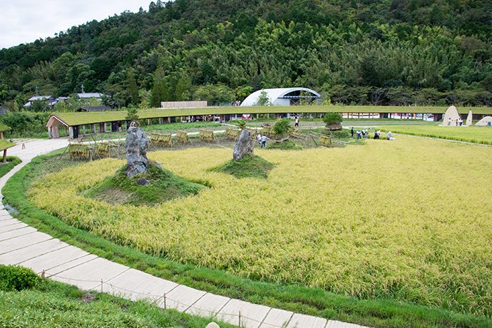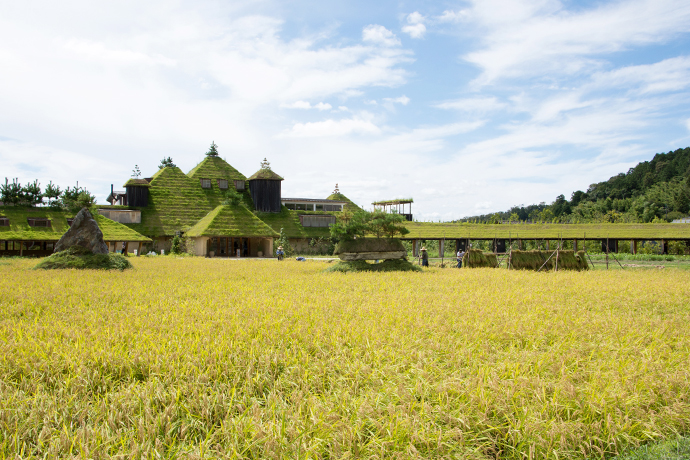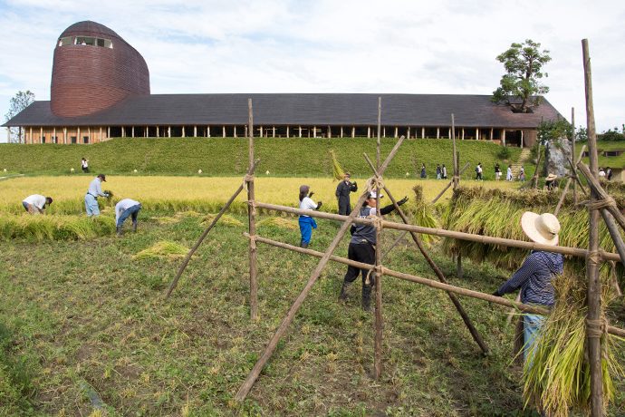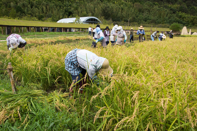 9月11日、たねや農藝のスタッフさん他20人ほどの少人数で「キヌヒカリ」という品種のお米の稲刈りをしました。雨天により、大勢が集まって行う予定だった9月9日の稲刈りが中止となったためです。 朝9時に田んぼに着くとすでに作業は始まっていました。ラ コリーナには一面の黄金色が広がっていました。