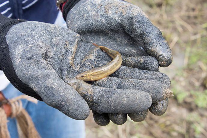 たねやグループでは農作物を無農薬で育てているからか作業の間、田んぼのあちらこちらで、バッタやトンボ、クモ、カエルにドジョウなど様々な小さな生き物たちの姿をたくさん見ることができました。