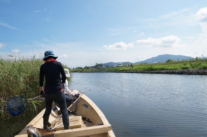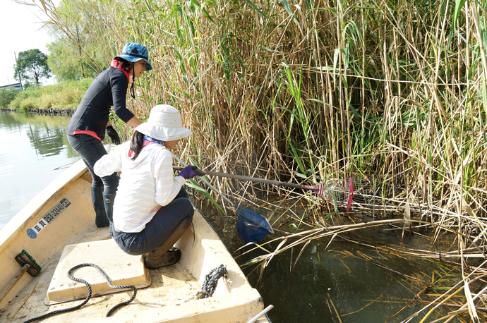 一見すると綺麗に見えた沢も、舟の上からだとびっくりするほどのゴミが見つかりました。ヨシの間に入り込んだゴミを、クワや網などを使って取り出します。