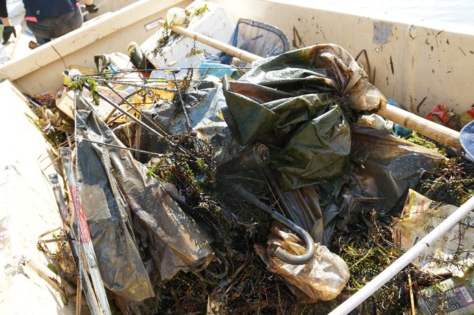 水中のゴミはヘドロに埋もれていて、とても重く簡単には引き上げられません。 舟を少しずつ進めてはゴミを拾う作業を繰り返し、沢の半分ぐらいのところで、こんなにたくさんのゴミが集まりました。